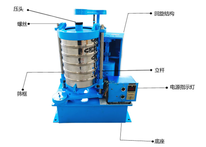 圓手柄,緊固手柄,壓頭,立桿,篩具,螺母,托盤(pán),振動(dòng)體,彈簧,彈簧座,底筒,地腳,殼體,振動(dòng)電機(jī) ,繼電器。