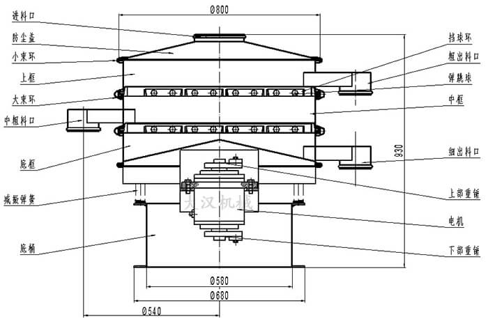 油漆除雜振動(dòng)篩利用YZUL立式振動(dòng)電機(jī)作為激振源,通過(guò)振動(dòng)電機(jī)上下兩端的偏心重錘將旋轉(zhuǎn)運(yùn)動(dòng)轉(zhuǎn)變?yōu)樗健⒋怪薄A斜的三次元運(yùn)動(dòng),并傳遞到旋振篩的篩面上;物料通過(guò)入料口進(jìn)入設(shè)備內(nèi),根據(jù)不同物料篩分要求,物料經(jīng)過(guò)1-5層采用不同目數(shù)的金屬編織篩網(wǎng)的篩分層,在這個(gè)過(guò)程中,位于各層的篩網(wǎng)下的清網(wǎng)裝置(彈跳球)通過(guò)頻率振動(dòng)不斷撞擊篩網(wǎng),使篩網(wǎng)上層物料能夠順暢的透網(wǎng)篩分,并有效解決了物料堵網(wǎng)問(wèn)題出現(xiàn),不同目數(shù)的物料通過(guò)各層對(duì)應(yīng)目數(shù)的篩網(wǎng)后在各層的出料口排出,從而實(shí)現(xiàn)篩選除雜或過(guò)濾分級(jí)的目的。調(diào)節(jié)上、下兩端的相位角,可以改變物料在篩面上的運(yùn)動(dòng)軌跡。